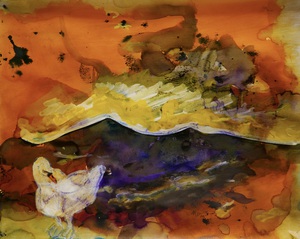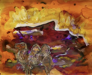 Abstracte landschappen op papier - denk aan berglandschappen, moeras, woestijn en vlaktes, waarbij de horizon, de scheiding tussen hemel en aarde centraal staat. De verf bestaat uit gebonden pigmenten op waterbasis. De pigmenten zijn gebonden met acrylaatbinder en of caseïne. Vaak op het einde voorzien van een laag vernis, die ook UV straling tegenhoudt.